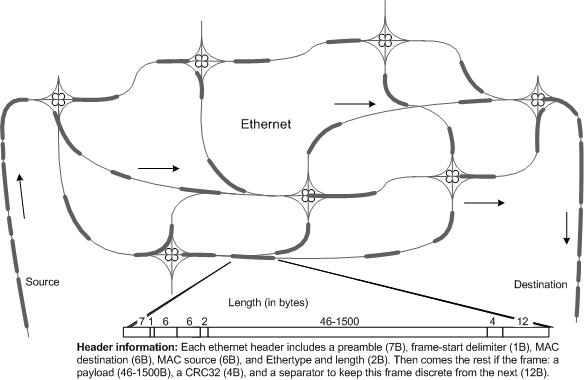 Ethernet looks more like a highway system in which a single stream of traffic (data) is split into many “vehicles” (frames or packets) of various sizes. The packets go streaming from the source to the destination through any available cloverleaf interchanges (network switches) by any accessible route across the network. The packets have innate knowledge, in the form of header information, of how to reassemble into a data stream as they approach the destination.