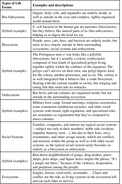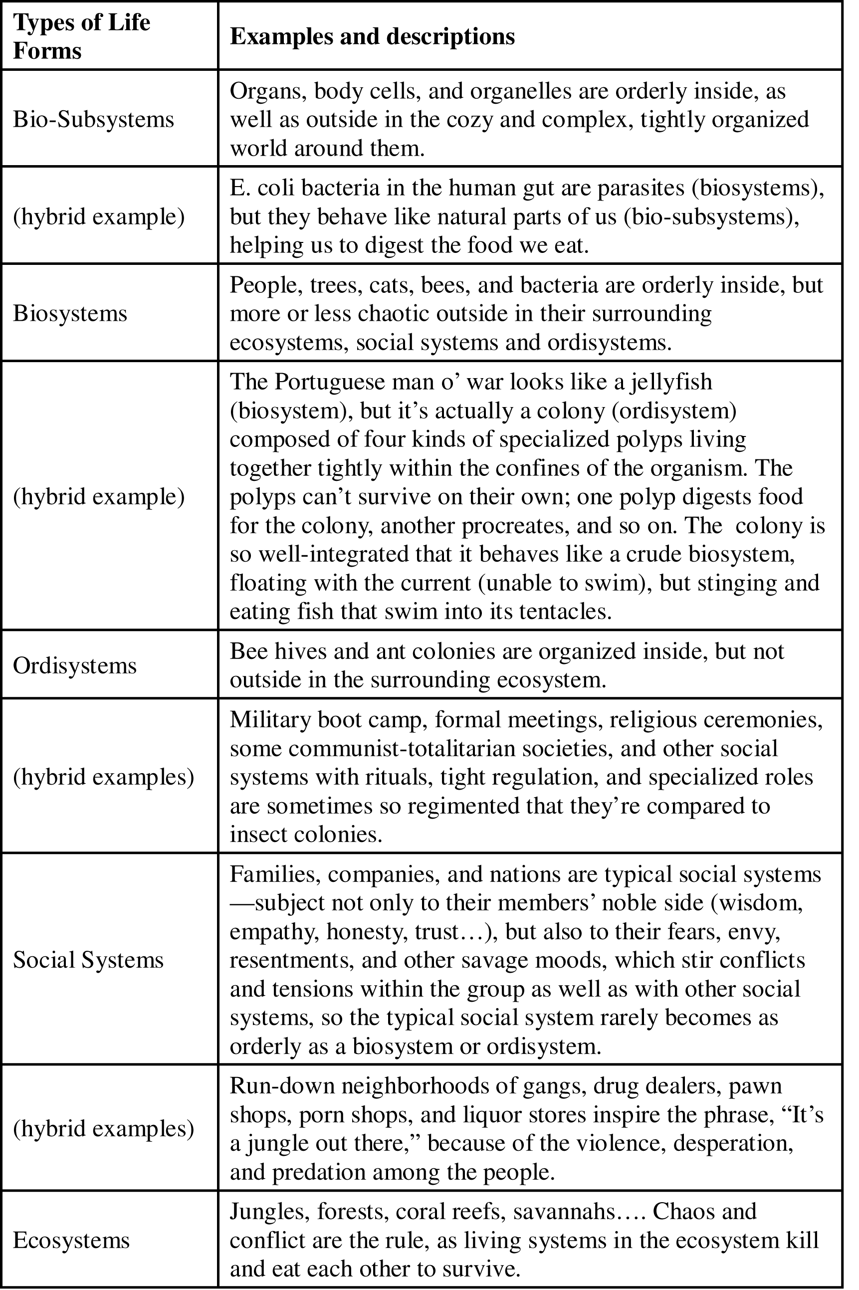 If we could step back and observe all the life forms on Earth, we’d see that most but not all fit neatly into these five groupings. Some seem to be hybrids. Or, stated differently, the five groupings don’t have a solid line between them; they sort of blend together as in the following table, which lists them in order of how organized they are, from most organized (top) to most chaotic (bottom).