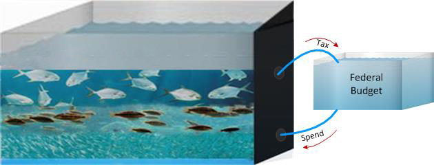 One tube pulls water out of the aquarium and into the smaller tank, and the other tube pumps water back into the aquarium. The small tank is mainly a holding tank. It represents the federal budget.