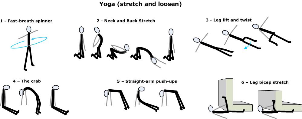 Yoga on the floor. I might do the six yoga exercises (dark figures) when I get home from work… or after I climb out of bed in the morning… or before climbing into bed at night. I always do the yoga-like exercises on the floor. These exercises keep my body limber and flexible.