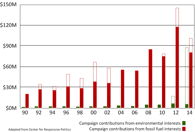 US campaign contributions from environmental interests (green) vs rich oil interests (red) illustrate how political decision-making is manipulated and perverted here in the US. There are some limits to the amount of hard money (solid colors) that can be given directly to candidates. Unlimited amounts of soft money (hollow colors) can be given to political parties for general purposes. Compare that with the UK, where legislation has prevented excessive spending by candidates since the “Corrupt and Illegal Practices Prevention Act of 1883.” (http://www.loc.gov/law/help/campaign-finance/uk.php)