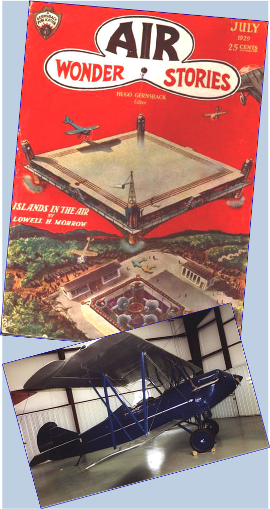 Inspired throughout his teens by pulp magazine yarns about flying like an eagle, Eugene became part owner of an OX-5 Travel Air 2000 biplane shortly after getting married to Mary Lookout. (pulp magazine cover by Frank R. Paul, biplane picture posted on Wikipedia by RuthAS).