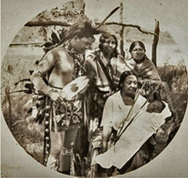 Standing (l-r): Eugene George Standing Bear (Lakota), his wife One Eagle or Mrs. Mary Nora Lookout-Standing Bear (Osage), and his mother-in-law Mrs. Julia Pryor Mongrain-Lookout (Osage), the wife of Fred Lookout.