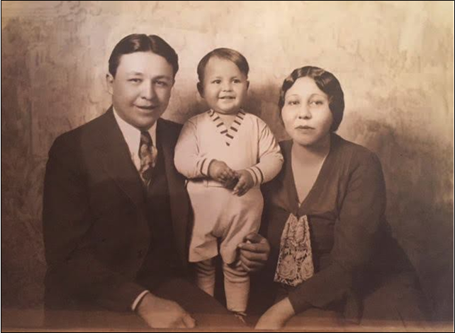 Sitting: Mrs. Three Soldiers (Lakota), the mother of Eugene George Standing Bear, holding her grandson, Child Chief or George Eugene Standing Bear (Lakota/Osage), the son of Eugene George Standing Bear and Mary Nora Lookout. Mrs Three Soldiers was the former Laura Cloud Shield, who had earlier married Luther Standing Bear, Eugene’s father.
