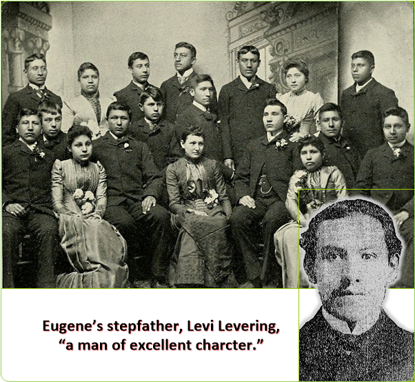 Carlisle’s second graduating class, 1890: Dennison Wheelock (Oneida). Stacy Matlack (Pawnee). Levi Levering (Omaha). William Tivis (Comanche). Jemima Wheelock (Oneida). Veronica Holliday (Chippewa). Benjamin Lowry (Winnebago). George W. Means (Sioux). Howard Logan (Winnebago). George Vallier (Quapaw). Percy Zadoka (Keechi). Lawrence Smith (Winnebago). William Morgan (Pawnee). Carl Leider (Crow). Benjamin Thomas (Pueblo). Rosa Bourassa Chippewa). Nellie Robertson (Sioux). Julia Bent (Cheyenne). [The cutline associated with this picture doesn’t make it clear as to who is where in the picture. I’m thinking Eugene’s stepfather, Levi Levering, might be top row, third from left.]