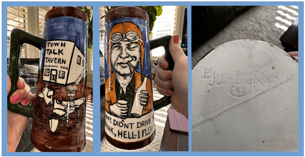 “… I thought it was so neat, as I am an airline pilot and the mug had a crashed airplane on one side in front of the Town Talk Tavern. Interesting! After doing a little research and reading a few of your articles this morning, I wanted to reach out to you about this mug. It looks like it is from 1963 and is in perfect condition….”