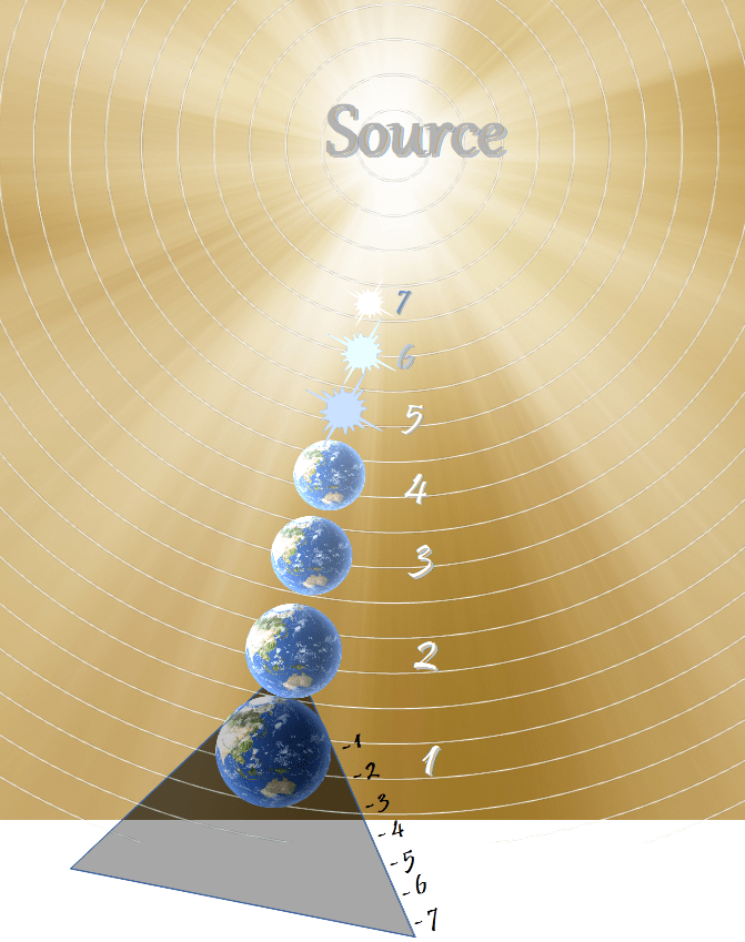 (The pulled-apart diagram to the right shows the vast, superimposed cosmos that’s created and nourished by an endless sea of life-energy brimming with vitality, consciousness, and refined motivations.)