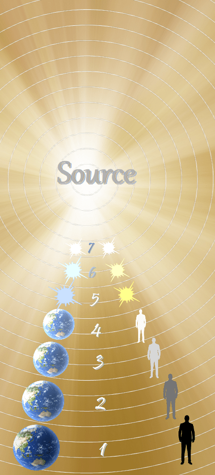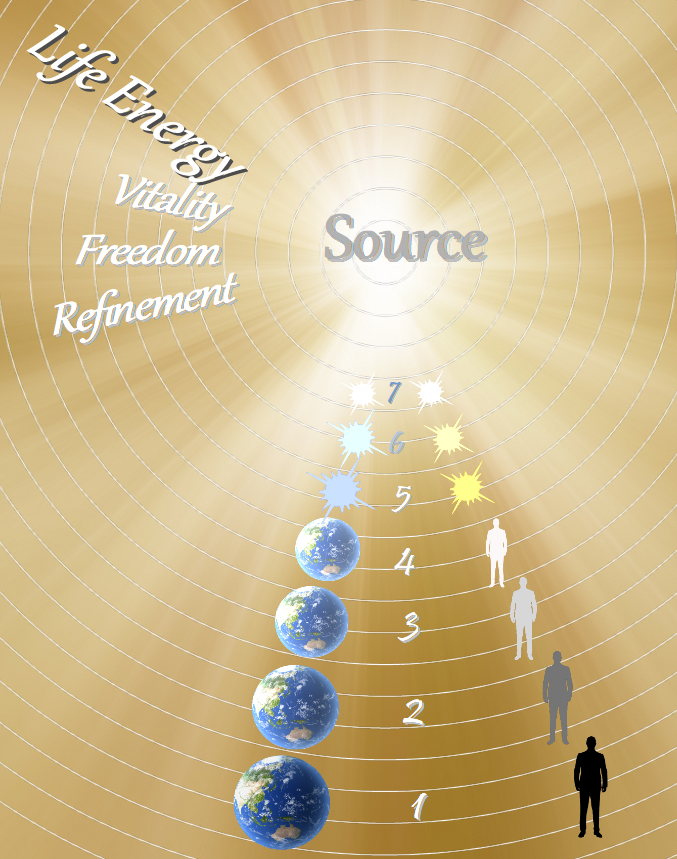 - As it leaves the source, the life-energy begins to devolve—vibrating slower and slower—as it moves into denser realms that become increasingly complicated and illusory. In other words, the perfect consciousness of the source becomes imperfect as living things adapt to their worlds and universes.