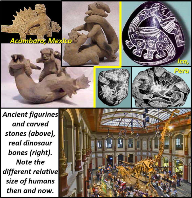 250,000,000 years ago. Mass Extinction #3—the largest in Earth’s known past—formed the Wilkes-Land crater in Antarctica. This Mass Extinction event (#3), and another (#4) that happened 40 million years later, together set the stage for dinosaurs to emerge on the planet. That’s apparently when Earth became a contentious world, with predators, parasites, and competitors all struggling to prevail, as suggested by ancient carvings dug up last century—Ica stones in Peru, and Acambaro figurines in Mexico. Apparently dinosaurs were a major headache for our superhuman ancestors.